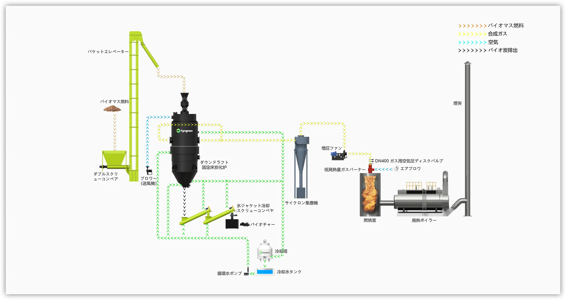 プロセス 木くず、わらブロック、竹くず、とうもろこしの芯、ココナッツ殻、バイオマスペレット燃料などの農林廃棄物やその他のバイオマスは、ガス化炉内で酸素供給を制限した状態で熱分解ガス化反応を起こし、可燃性ガスとバイオ炭を生成します。バイオマスから変換された可燃性ガスは、断熱炉内で直接パイプで送られ燃焼され、高温の排ガスを発生させます。この排ガスの熱は廃熱ボイラーで熱交換され、住宅用または産業用の蒸気(温水)を生成します。バイオ炭は日常生活、工業生産、農業生産で使用されます。